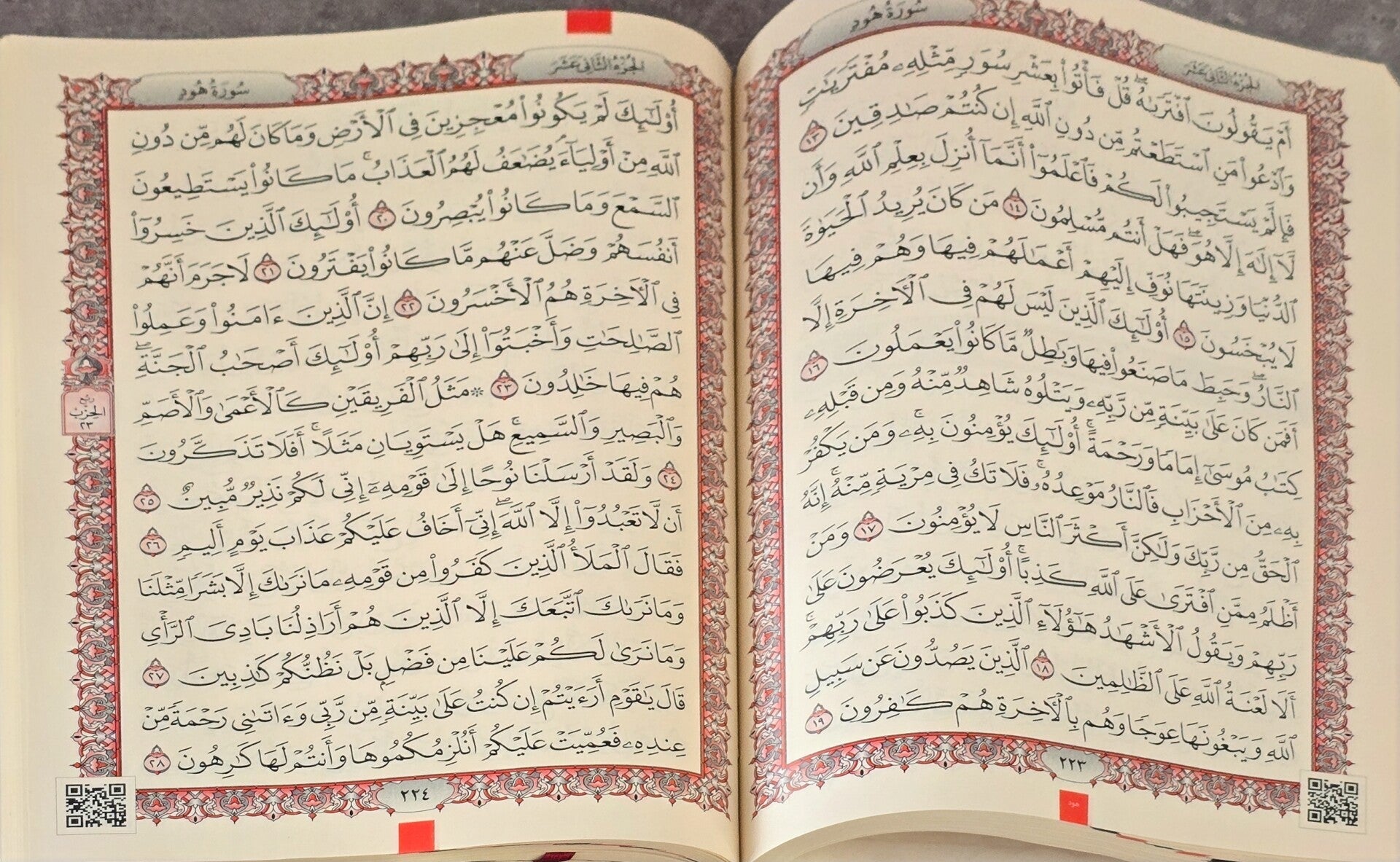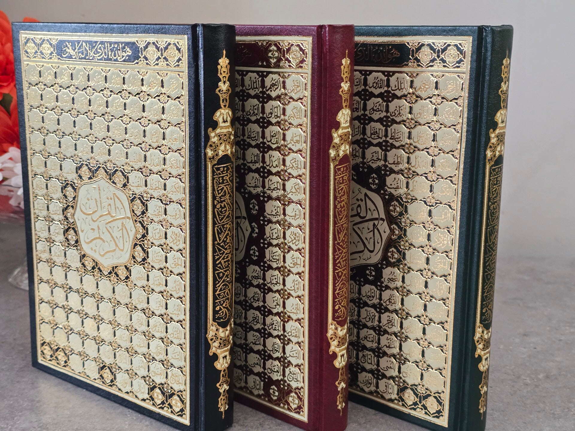Saint Coran arabe hafs couverture dorée texturée ornée des 99 noms d'Allah avec code barre intégré.